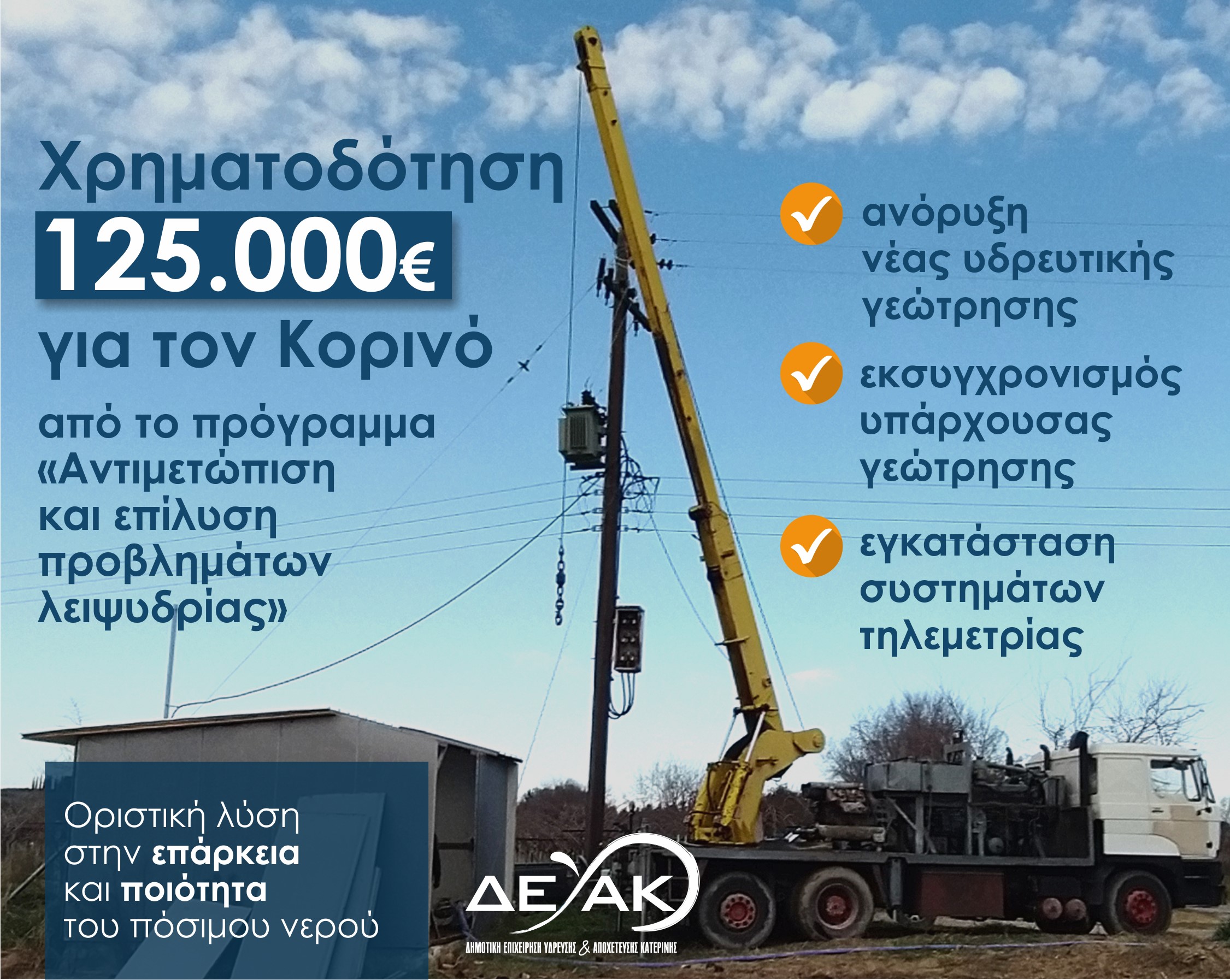 Εγκρίθηκε από το Υπουργείο Εσωτερικών η χρηματοδότηση με 125.000€ του έργου της ανόρυξης νέας υδρευτικής γεώτρησης στη Δημοτική Κοινότητα Κορινού, μετά από τη μελέτη που εκπόνησε το 2024 η Δημοτική Επιχείρηση Ύδρευσης και Αποχέτευσης Κατερίνης.