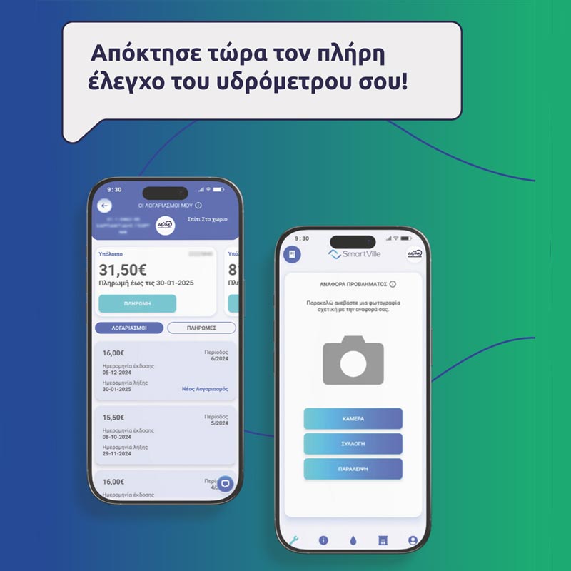 • Αναφορά προβλήματος υδροδότησης με φωτογραφία, περιγραφή και τοποθεσία σε χάρτη κι ενημέρωση για την πορεία επίλυσής του.